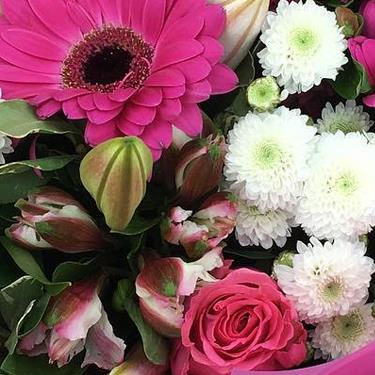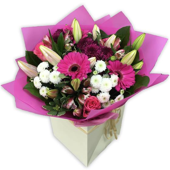 This elegant bouquet blends budding oriental lilies, cerise gerberas, pink alstroemeria, spray roses, white button chrysanthemums and deep plum blooms, beautifully presented for a charming, sophisticated gift.