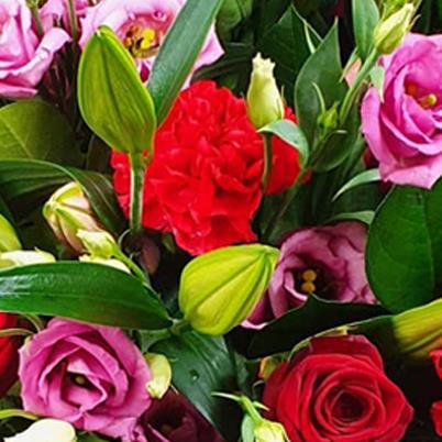 Blush pink lisianthus, scarlet carnations, deep-red roses and tender lilies nestle in verdant foliage, wrapped in soft tissue for a gentle, romantic flourish.