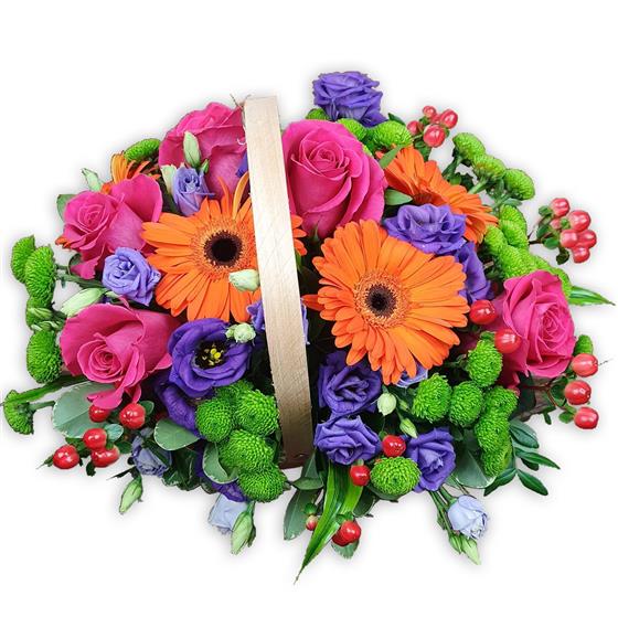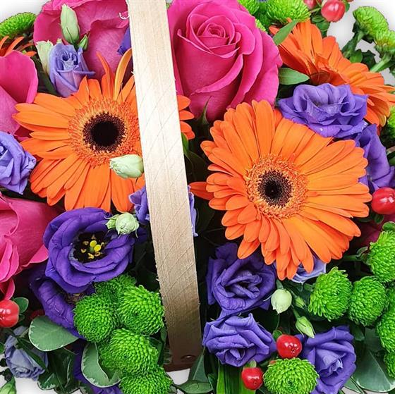 Bright gerberas and fuchsia roses dance with purple lisianthus, green button chrysanthemums and vibrant berries in a charming basket arrangement, inspiring smiles with every radiant bloom.