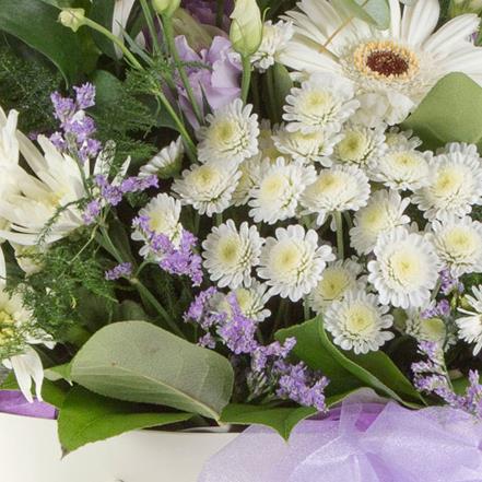 A crisp looking hand-tied bouquet of white and lilac blooms mixed with delicate foliage.