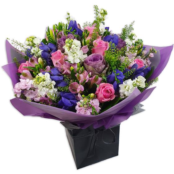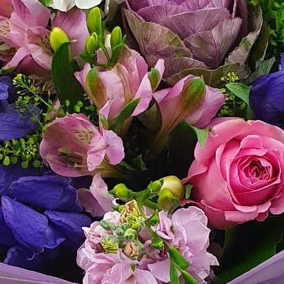 A richly textured flower arrangement featuring roses, stocks, alstroemeria, lisianthus and seasonal filler flowers, finished with fresh foliage. A balanced mix of soft pinks, purples and whites arranged for depth, movement and natural elegance.