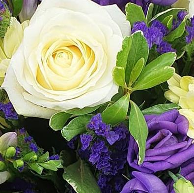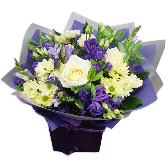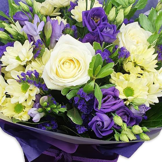 Design includes a central ivory rose surrounded by creamy chrysanthemums, purple lisianthus, lavender-toned buds, delicate statice and fresh green foliage, arranged into a balanced bouquet with soft colour contrast, gentle texture and a relaxed, elegant finish.