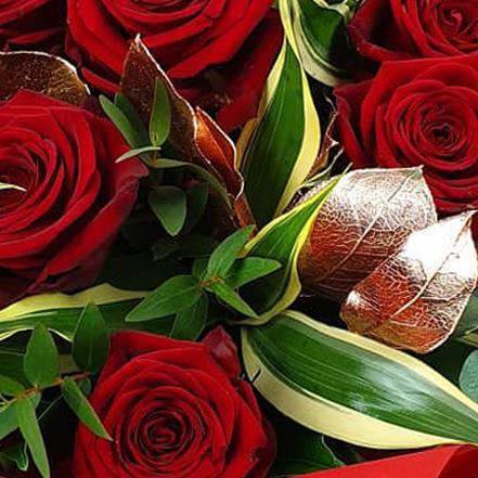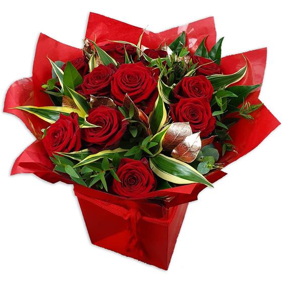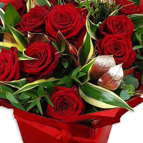 Design includes premium red roses set among sculptural variegated foliage, glossy green leaves and metallic accent details, creating a rich, dramatic bouquet with depth, contrast and a strong, polished finish that feels indulgent and assured.