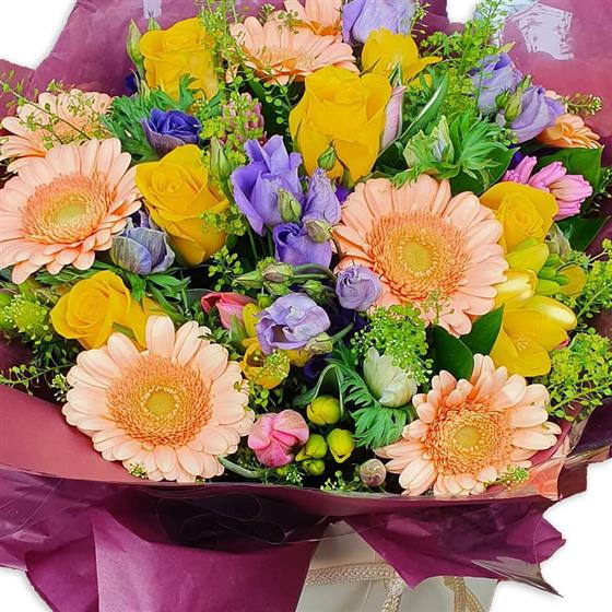 Peach gerberas, golden roses and violet lisianthus mingle with yellow freesias, lime viburnum and soft pink spray roses, nestled in lush greenery for a gentle, sunrise-inspired bloom.