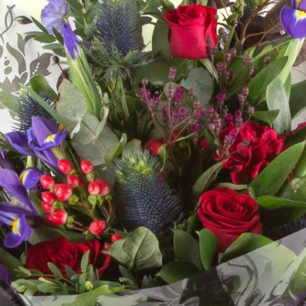 An impressive hand-tied bouquet in shades of red and purple including aconitum, eryngium, iris and roses.