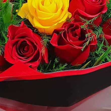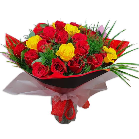 Design includes classic red and vibrant yellow roses arranged with soft ferny foliage and fresh green accents, creating a bold, eye-catching bouquet full of warmth, contrast and strong colour impact.