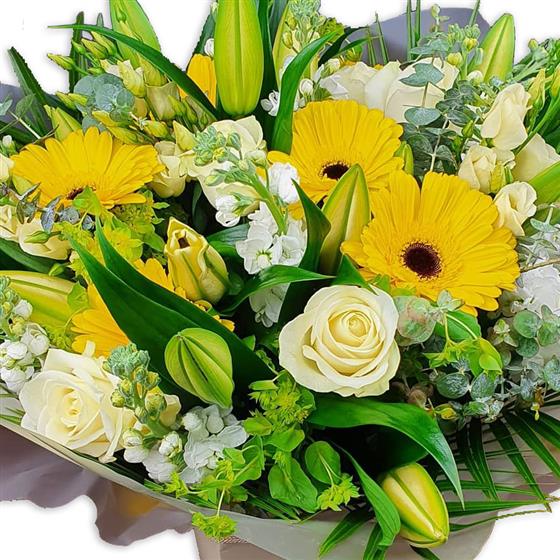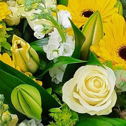 A fresh flower arrangement featuring gerbera, roses, lilies, stocks and seasonal foliage. Clean yellow and white tones are balanced with layered greenery to create a bright, uplifting design with a crisp, contemporary finish.