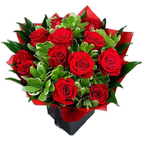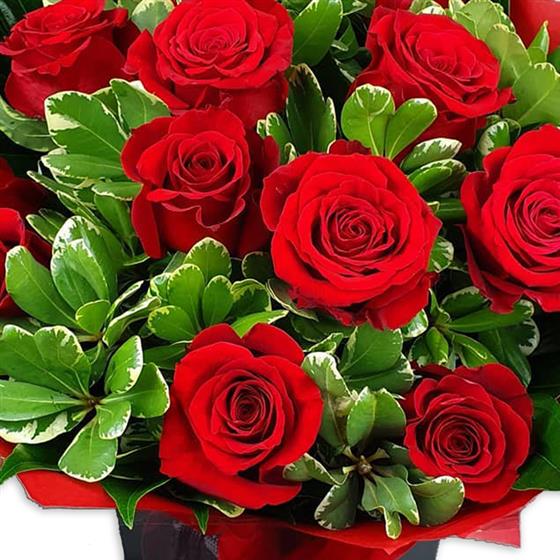 Design includes classic red roses arranged with glossy variegated foliage and rich green leaves, creating a strong, timeless bouquet with deep colour, clean lines and confident, elegant impact.
