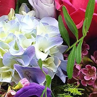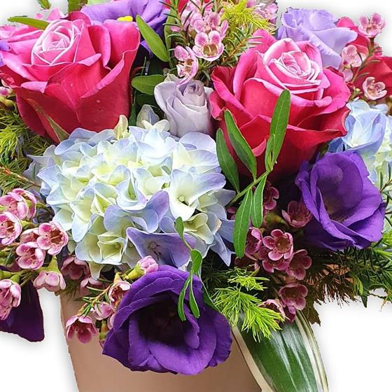 A refined flower arrangement including roses, hydrangea, lisianthus and waxflower, combined with seasonal foliage. Soft pastel tones and layered textures create a balanced, elegant design with a fresh, contemporary feel.