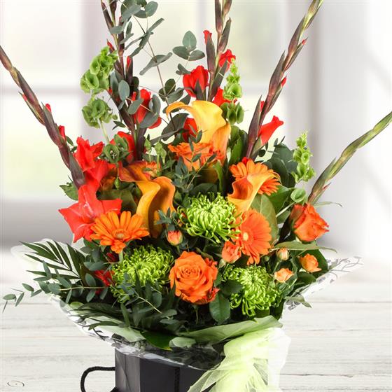 A lavish gift of exotic orange and lime blooms presented in a stylish gift bag.
