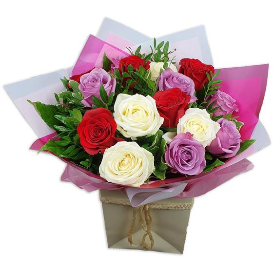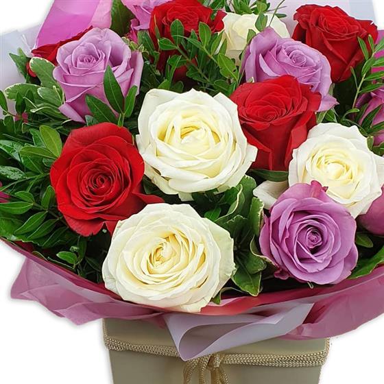 Brighten any space with classic red, creamy white and soft lilac roses arranged with fresh green foliage, forming a well-balanced bouquet that blends bold colour with gentle tones and a clean, elegant finish.