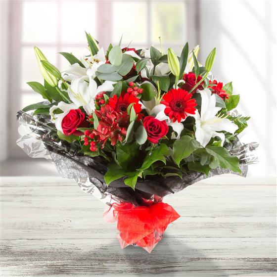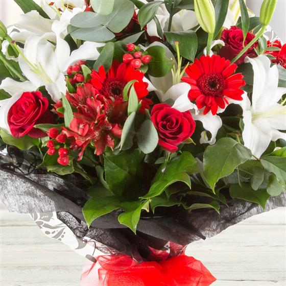 A highly scented hand-tied bouquet of oriental white lilies, berries, roses and scarlet red gerbera.
