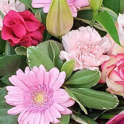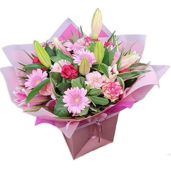 A fresh pink-toned bouquet designed with gerbera daisies, roses, carnations, unopened lilies and layered green foliage, arranged to give gentle height, soft texture and a bright, contemporary floral look.