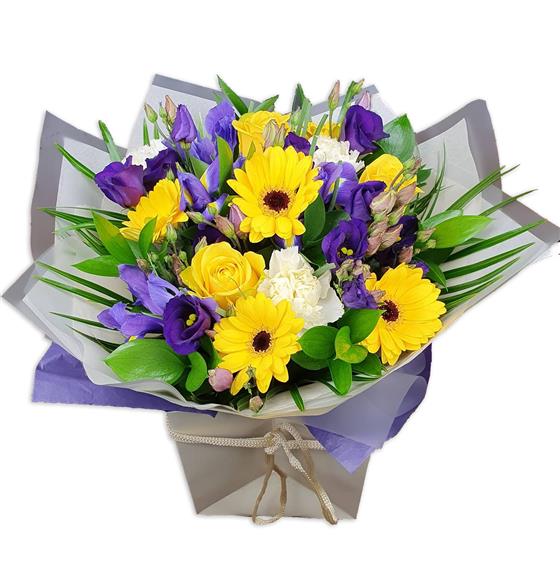 Design includes gerbera daisies, roses, lisianthus, soft white blooms and fresh green foliage, arranged into a lively bouquet with bold contrast, balanced structure and a bright, uplifting finish.