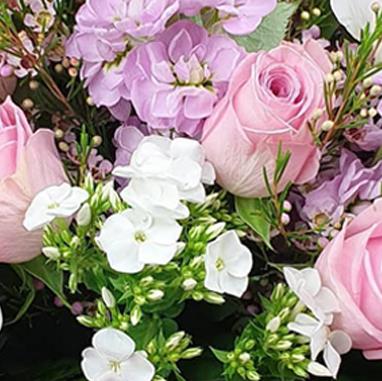 Blush roses, creamy peony and delicate white phlox paired with pale pink stock, tiny waxflower and lush fern fronds evoke gentle, poetic beauty.