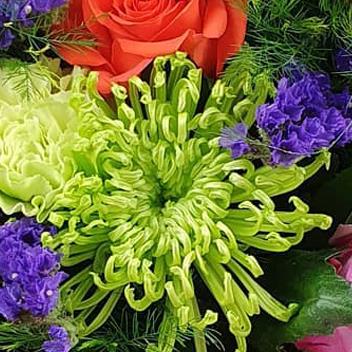 A bold and cheerful flower bouquet combining vibrant pinks, fresh greens and warm orange tones. Designed with gerbera, roses and lilies, finished with textured blooms and foliage for a lively, eye-catching display.