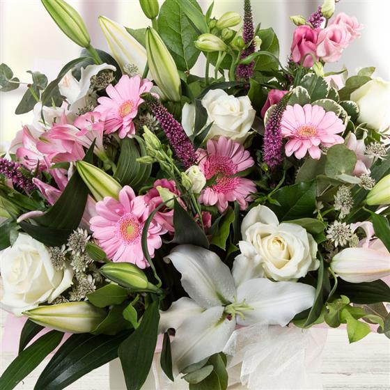 A scented bouquet including oriental lilies, veronica, roses, gerberas and lisianthus presented in a matching gift bag.